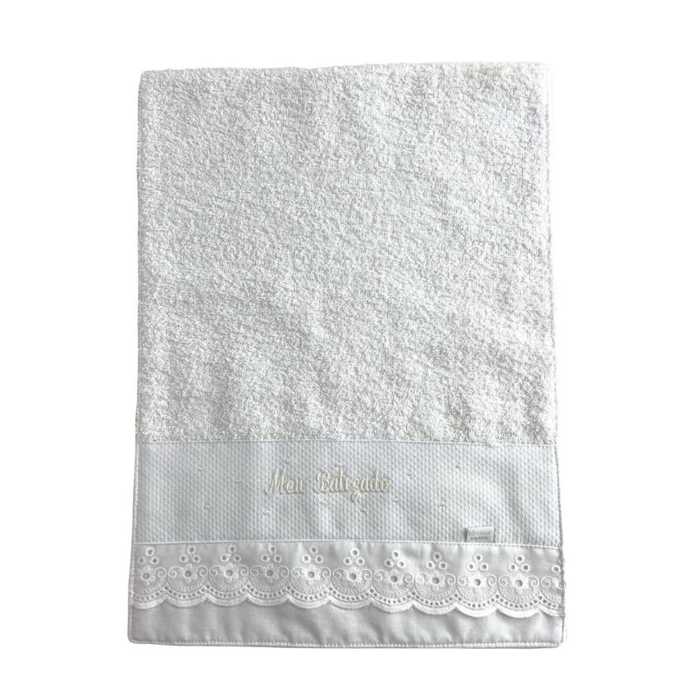 Toalhinha felpuda branca, com bordado Meu Batizado e detalhes em bordado inglês.