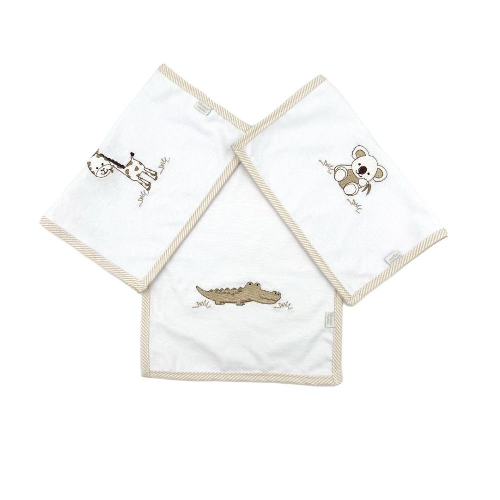 Boquinha malha penteada fio 30 em 100% algodão da Coleção Savanah Nude. Embalagem com 3 fraldinhas bordadas e viés listrado nude, em malha suave que não agride a pele do seu bebê. Malha dupla (frente e verso) tornando-se mais macia