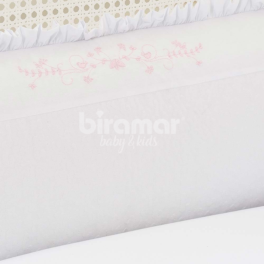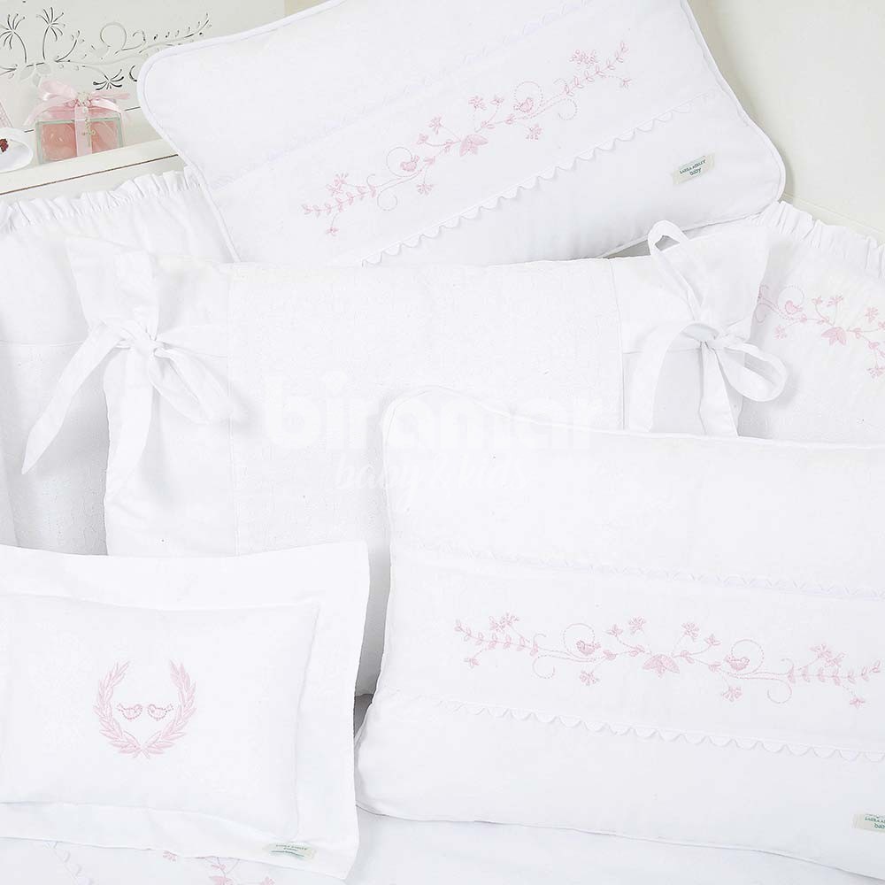 Enxoval de berço 7 peças da Coleção Valencia Rosa. Em percal 100% algodão é macio e suave. Para a mamãe que quer um enxoval clássico e delicado, a Coleção Valencia Rosa vem com detalhes de ponto acolchoado e babados plissados. Gracioso bordado com passarinhos traz o charme valenciano para a bebê. 7 peças pra deixar o quartinho da sua bebê um charme.