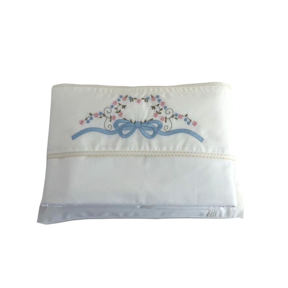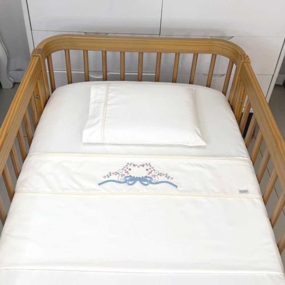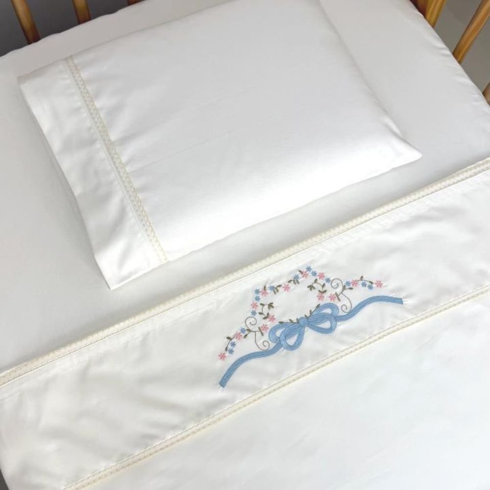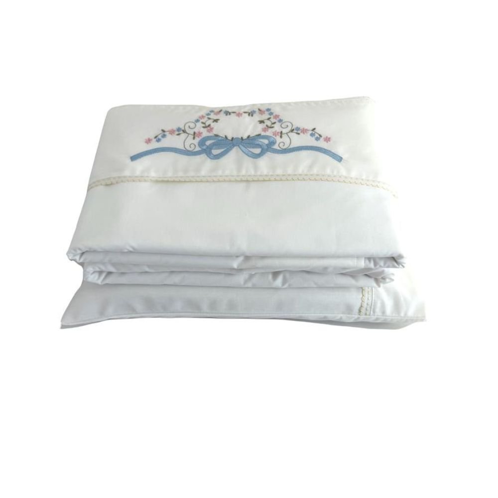 Jogo de Lençol para Berço 3 peças Percal 180 Fios 100% Algodão Marfim Bordado Laço Azul
