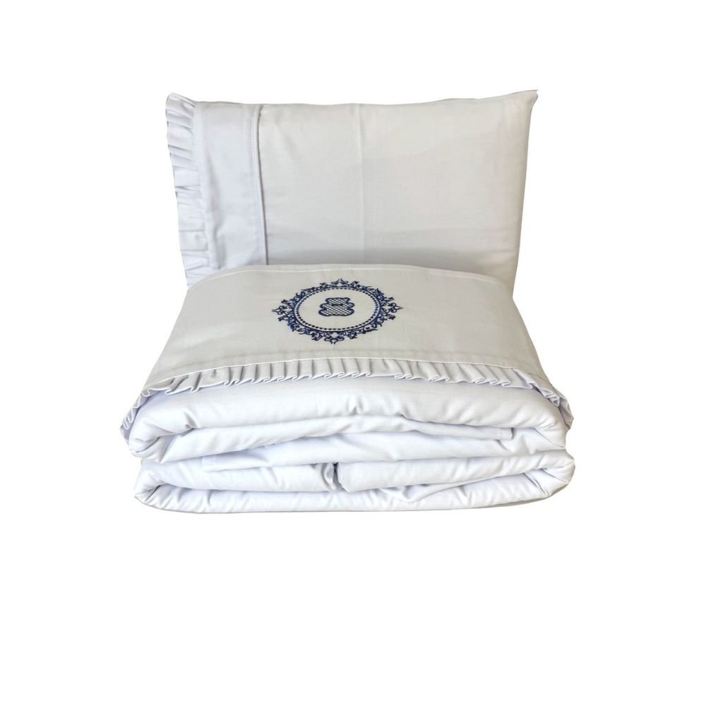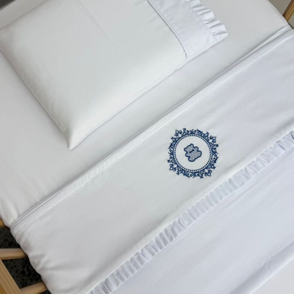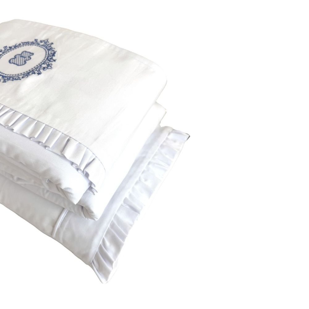 Lençol de berço 3 peças da Coleção Vineyard Marinho. Lençol superior, lençol inferior e fronha em percal 200 fios acetinado, 100% algodão. Toque suave e macio, sendo o lençol de baixo com elástico, proporcionando facilidade na colocação no colchão. Com bordado em brasão de ursinho.