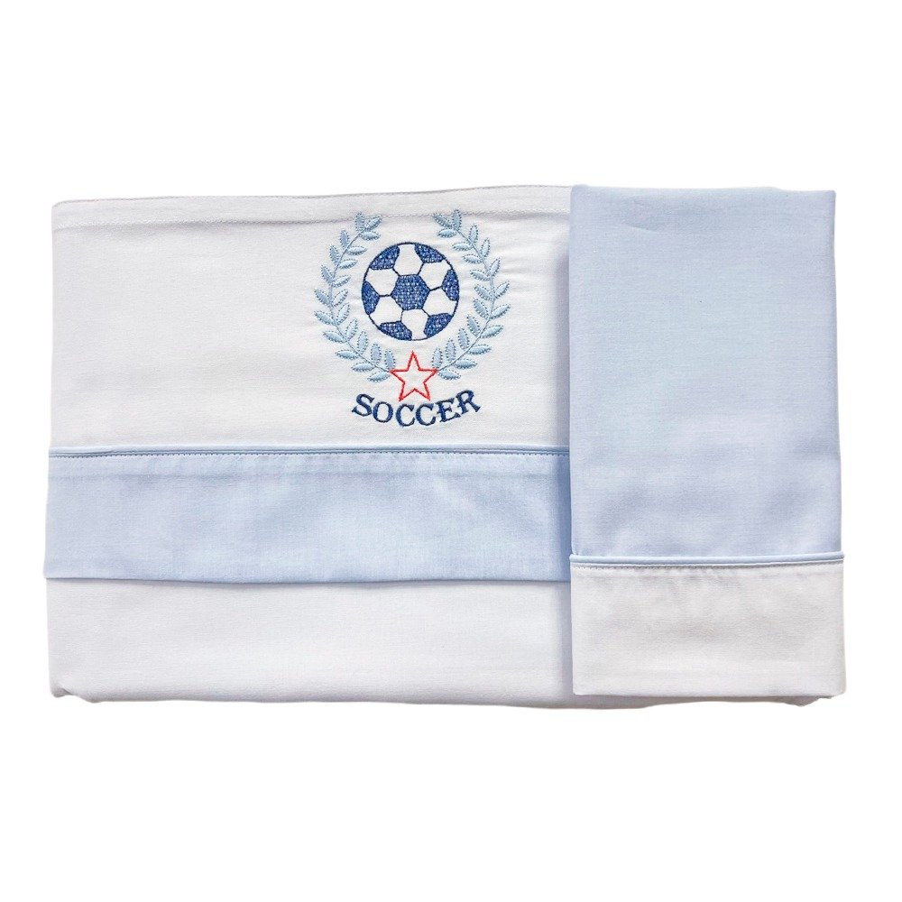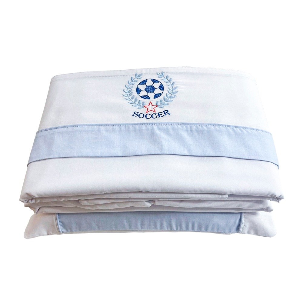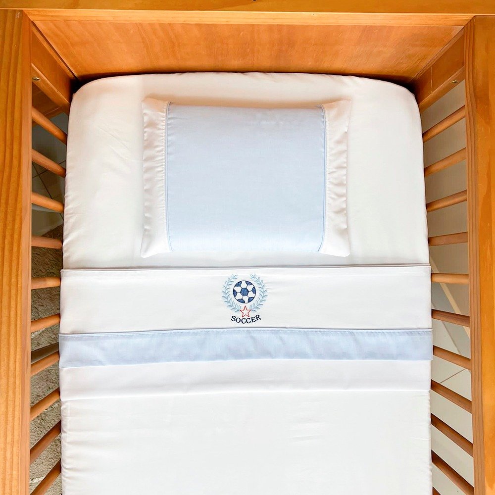 Lençol de berço 3 peças da Coleção Goal Azul. Lençol superior, lençol inferior e fronha em percal 100% algodão. Toque suave e macio, sendo o lençol de baixo com elástico, proporcionando facilidade na colocação no colchão. Lindos detalhes em bordados.