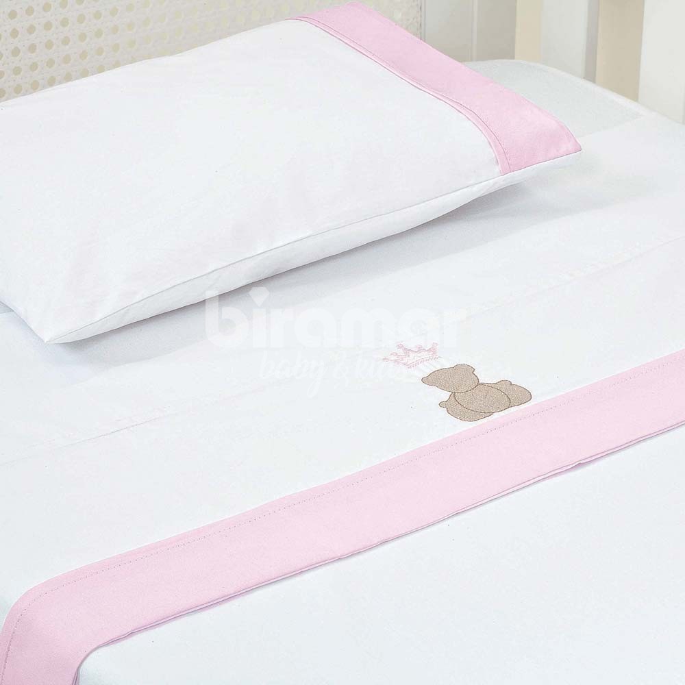 Lençol de berço 3 peças da Coleção Theodore Rosa. Lençol superior, lençol inferior e fronha em percal 100% algodão. Toque suave e macio, sendo o lençol de baixo com elástico, proporcionando facilidade na colocação no colchão. Detalhes em bordado e barrado rosa.