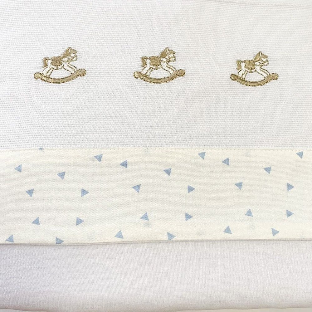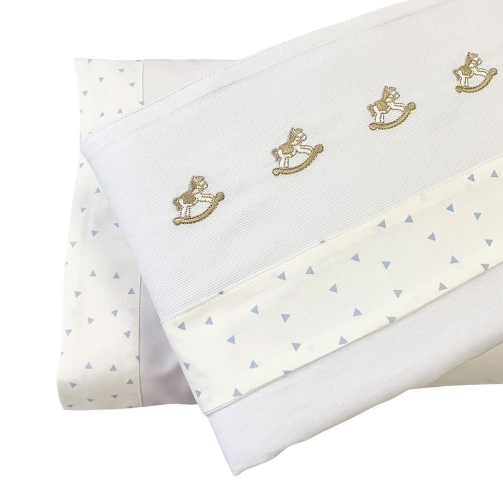 Lençol de berço 3 peças da Coleção Lolli Cavalinho Azul. Lençol superior, lençol inferior e fronha em 100% algodão. Toque suave e macio, sendo o lençol de baixo com elástico, proporcionando facilidade na colocação no colchão. Detalhes em bordado de cavalinho de pau e em estampa geométrica.