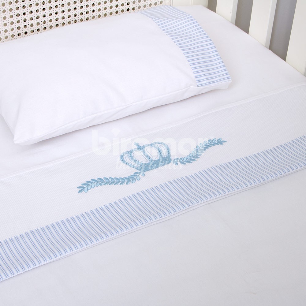 Lençol de berço 3 peças da Coleção Lolli Coroinha Azul. Lençol superior, lençol inferior e fronha em 100% algodão. Toque suave e macio, sendo o lençol de baixo com elástico, proporcionando facilidade na colocação no colchão. Detalhes em bordado de coroinha azul e em listras.
