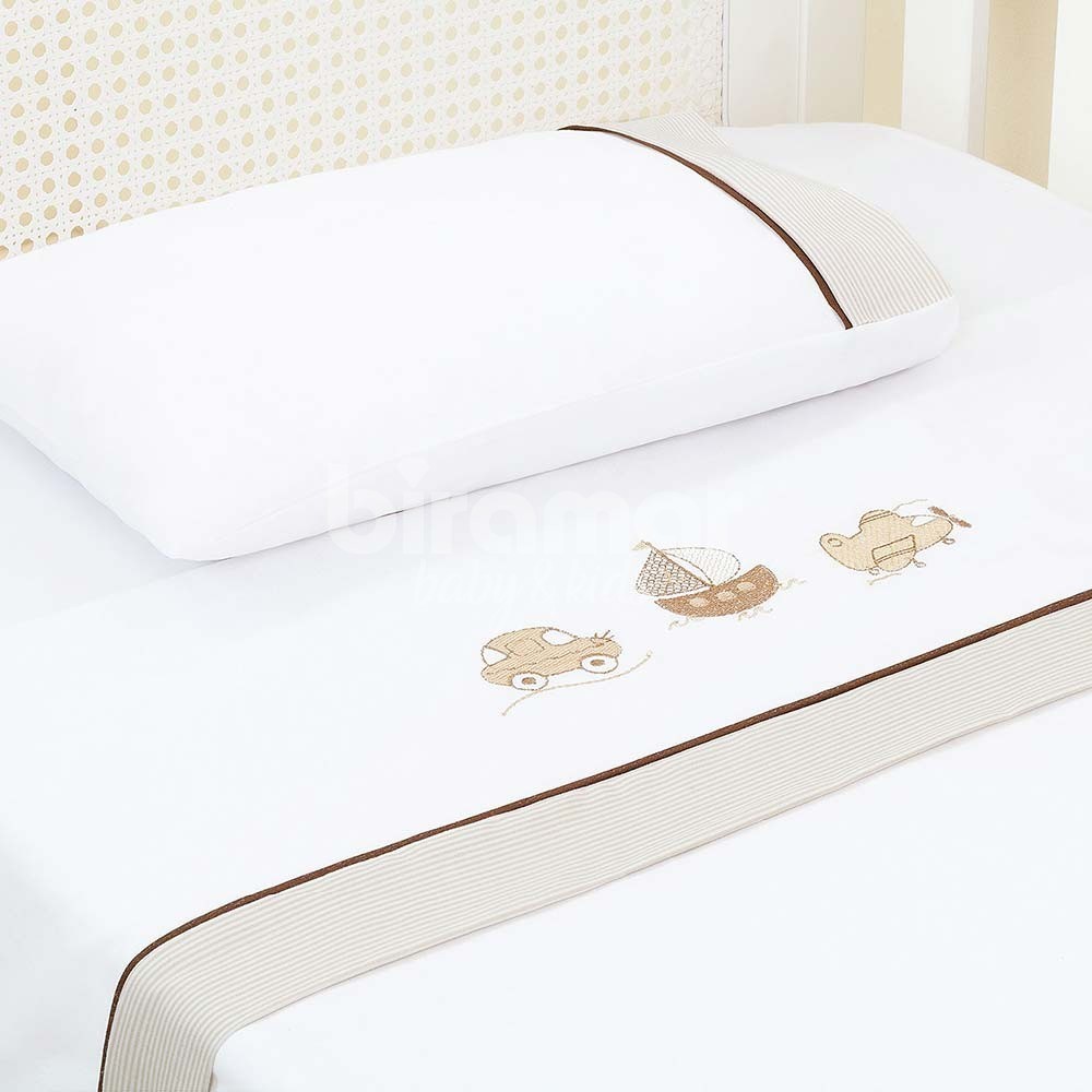 Lençol de berço 3 peças da Coleção Lolli Urbano Nude. Lençol superior, lençol inferior e fronha em 100% algodão. Toque suave e macio, sendo o lençol de baixo com elástico, proporcionando facilidade na colocação no colchão. Detalhes em bordado e em listras nude.