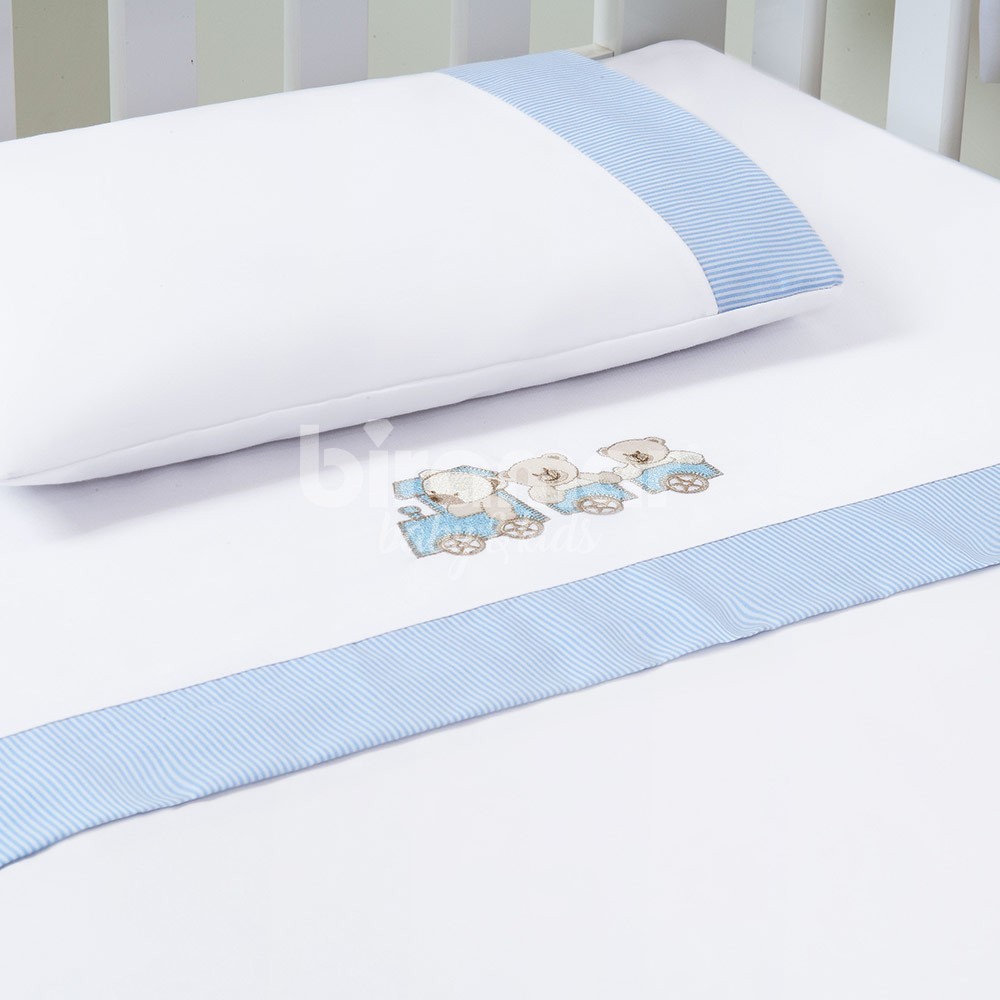 Lençol de berço 3 peças da Coleção Lolli Ursinho Listrado Maquinista Azul. Lençol superior, lençol inferior e fronha em 100% algodão. Toque suave e macio, sendo o lençol de baixo com elástico, proporcionando facilidade na colocação no colchão. Detalhes em bordado e em listras.