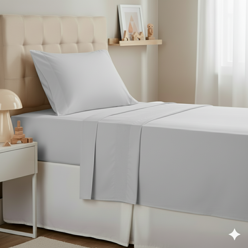 Lençol Montessoriano Solteiro 3 peças percal cinza. Lençol superior, lençol inferior e fronha em percal 100% algodão. Toque suave e macio, sendo o lençol de baixo com elástico, proporcionando facilidade na colocação no colchão.