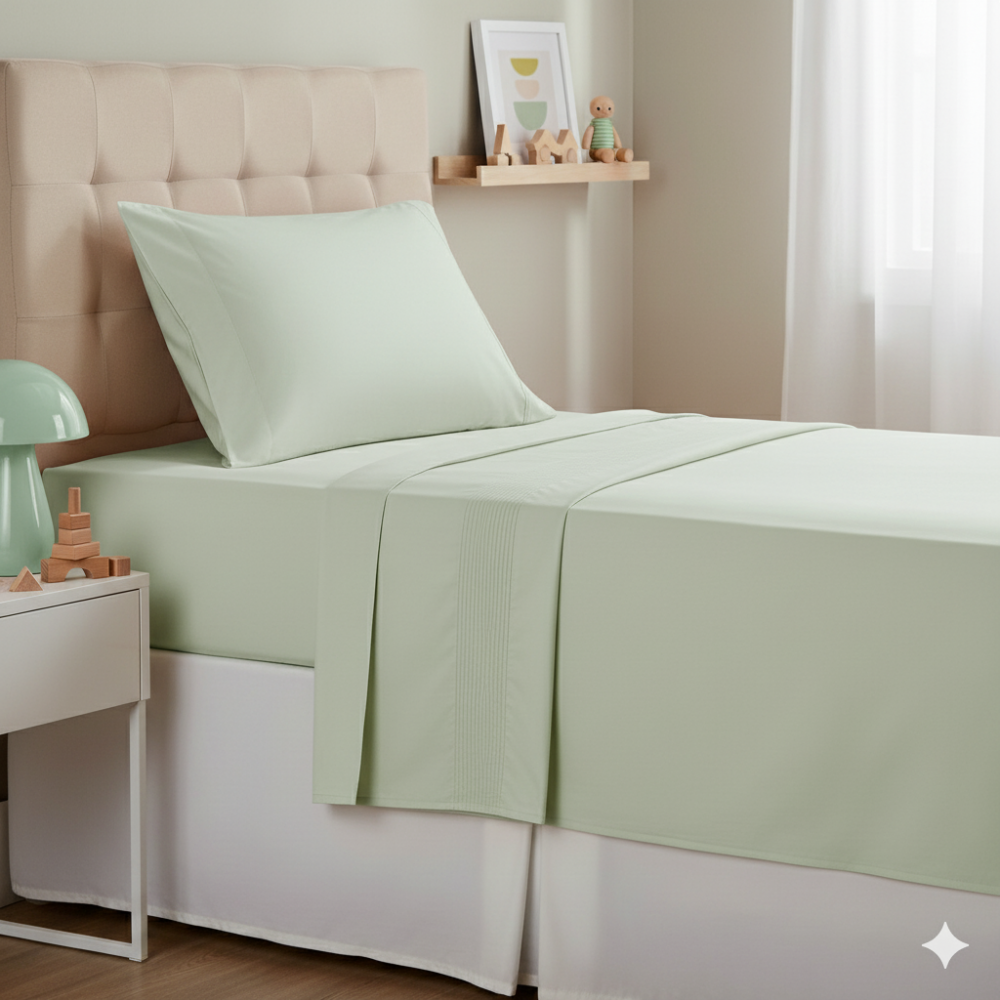 Lençol Montessoriano Solteiro 3 peças Mint. Lençol superior, lençol inferior e fronha em percal 100% algodão. Toque suave e macio, sendo o lençol de baixo com elástico, proporcionando facilidade na colocação no colchão. Detalhes em nervuras.