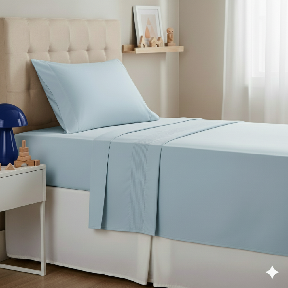 Lençol Montessoriano Solteiro 3 peças percal azul. Lençol superior, lençol inferior e fronha em percal 100% algodão. Toque suave e macio, sendo o lençol de baixo com elástico, proporcionando facilidade na colocação no colchão. Detalhes em nervuras.