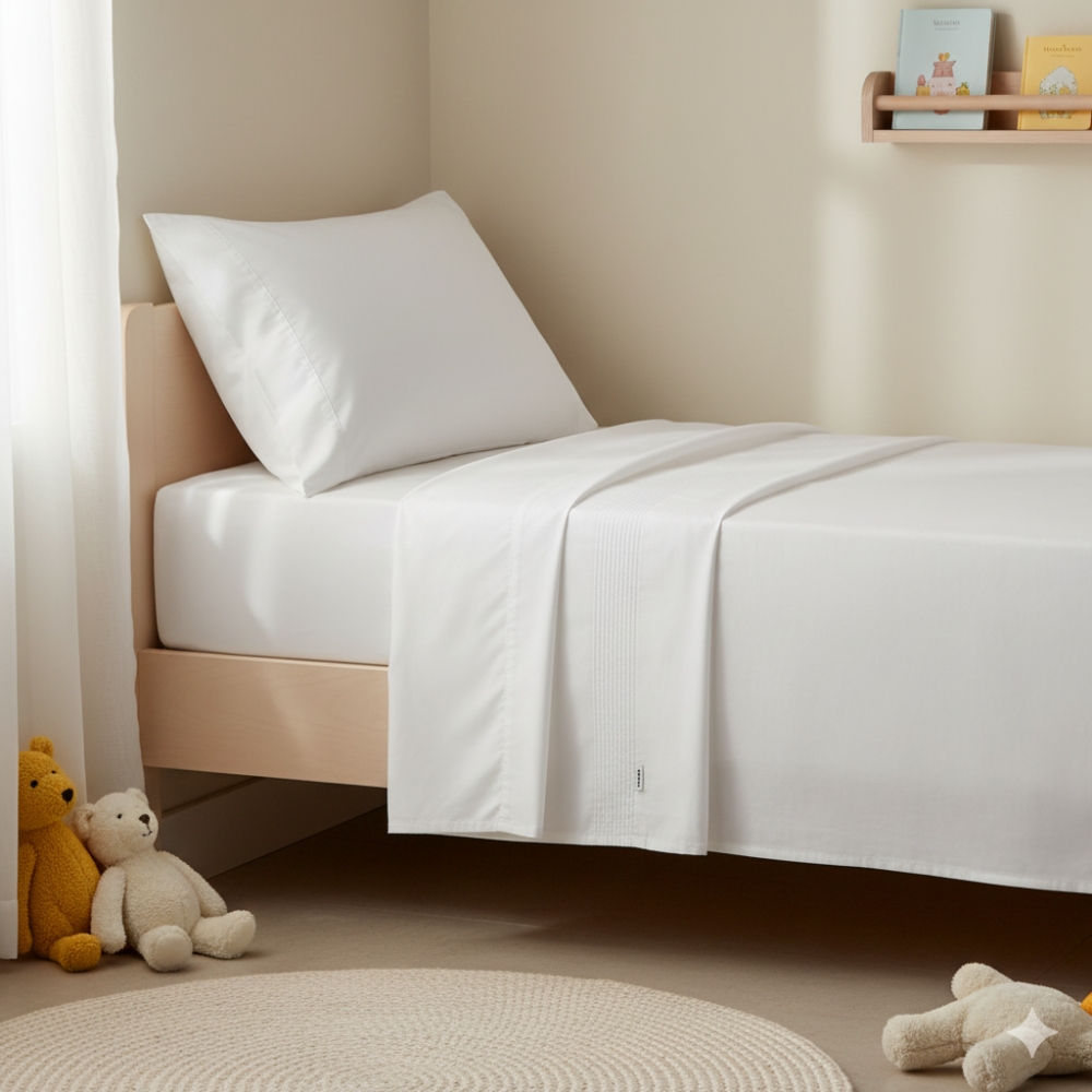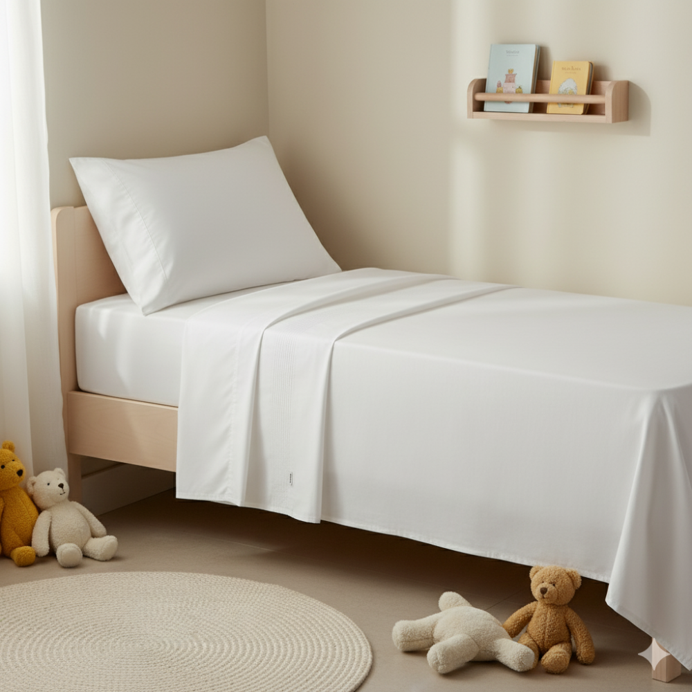 Lençol Montessoriano Solteiro 3 peças percal branco. Lençol superior, lençol inferior e fronha em percal 100% algodão. Toque suave e macio, sendo o lençol de baixo com elástico, proporcionando facilidade na colocação no colchão. Detalhes em nervuras.