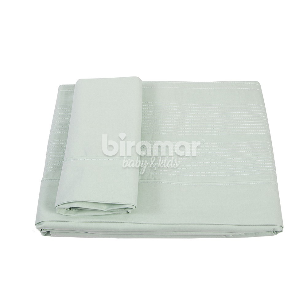 Lençol Montessoriano Solteiro Cama Box 3 peças Mint. Lençol superior, lençol inferior e fronha em percal 100% algodão. Toque suave e macio, sendo o lençol de baixo com elástico, proporcionando facilidade na colocação no colchão. Detalhes em nervuras.